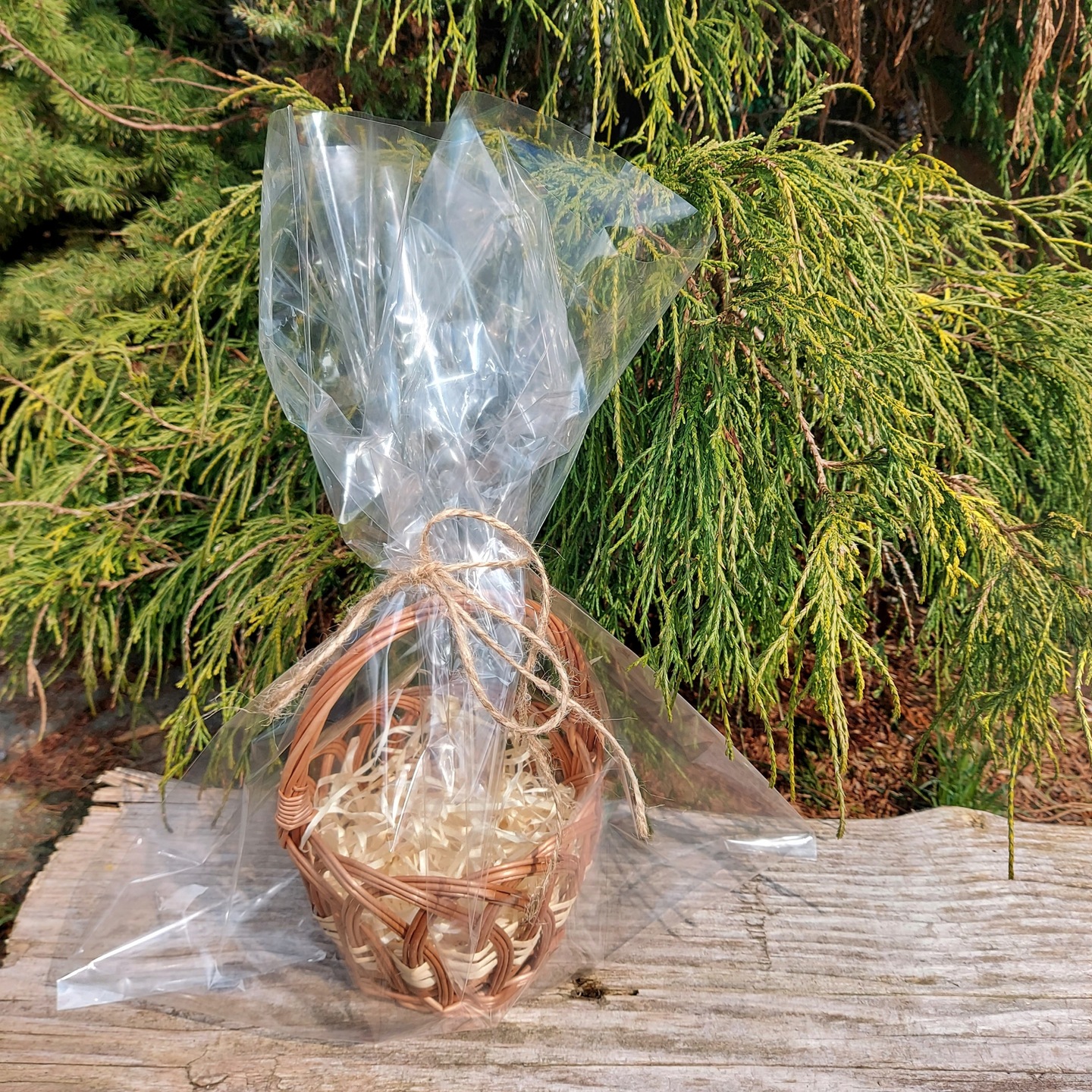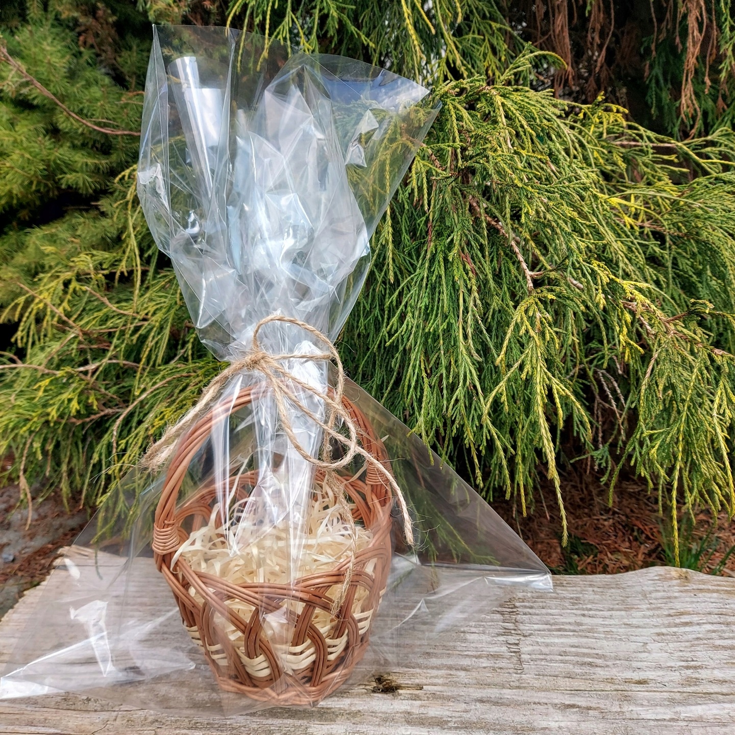 Odkryj urokliwy, ręcznie wyplatany koszyk prezentowy, idealny do stworzenia wyjątkowego upominku na każdą okazję. Wypełniony naturalnym wypełniaczem, czeka na spersonalizowanie wybranymi drobiazgami i smakołykami. Całość elegancko zapakowana w przezroczysty celofan i przewiązana naturalnym sznurkiem, tworząc gotowy do wręczenia, stylowy prezent.