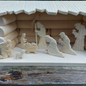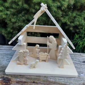 Mała Bożonarodzeniowa drewniana szopka stajenka rzeźbiona figurki 14x11x10